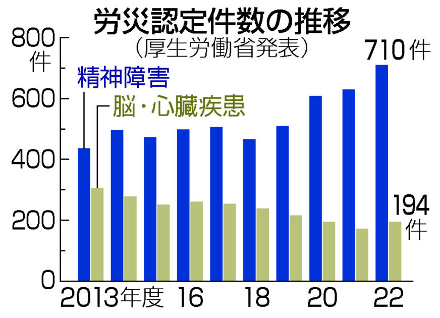 厚生労働省が30日発表した2022年度の労災補償状況によると、仕事での強いストレスによる精神障害に対する労災認定は710件に上った。