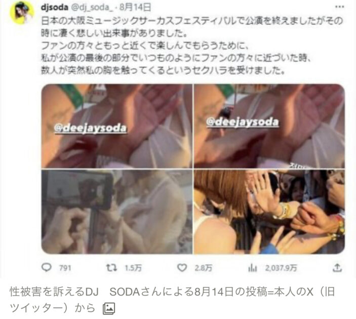 韓国の女性アーティスト「DJ SODA(ソダ)」さんが、大阪での音楽フェスティバルで観客に突然胸を触られたとSNSで声を上げた。これに対し、DJ SODAさんの服装のせいではないかなどという反応が相次いだ。「露出が多いのは危険」「服装を変えるべき」――。内閣府「女性に対する暴力に関する専門調査会」委員で広島大学准教授の北仲千里さん(56)は、どう見たか。