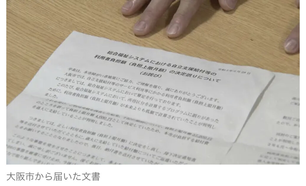 湯川さんの場合、上限額は4600円と通知されていましたが、それは誤り。実際は3万7200円だったというのです。大阪市からの文書は、誤っていたことによる差額分、2年間で計約65万円の支払いを追加で求める通知でした。