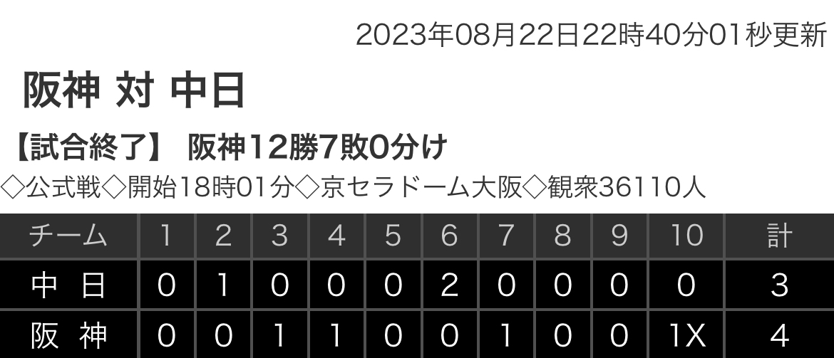 阪神 0 0 1 1 0 0 1 0 0 1x |4
