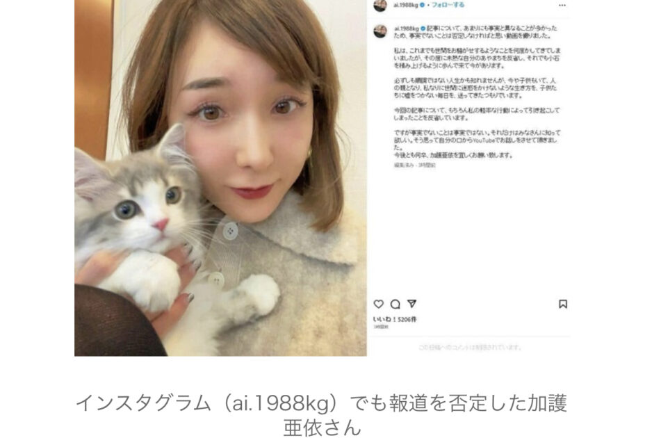 加護さんは「【FLASHの報道について】」というタイトルの動画を公開。記事では暴◯団幹部のX氏と「一緒に韓国旅行に出かけることになった」と書かれていたが、「私は元々韓国旅行に親友と行く約束をしておりまして、2人で一緒に行って2人で帰ってきました」と否定した。