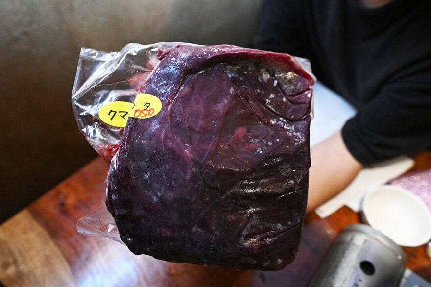 ちなみに駆除されたクマは体長2メートル10センチ、前足の幅が20センチ、推定体重は330キロだった。駆除直後に「でかいクマが捕れたよ」と業者から連絡を受けた林さんは、いつも通り「炭火焼用」と「オハウ(鍋)用」の部位を発注。「ヒグマは脂身のある〝ロース〟が一番うまいんですが、300キロを超えるような大きな個体だと、ロースはスジが入って固くなりやすい。〝OSO〟だとは知りませんでしたが『でかいクマだ』ということだったので、今回は巨体でも柔らかい〝内モモ〟を一頭分と〝肩ロース〟合わせて7キロほど仕入れました」
