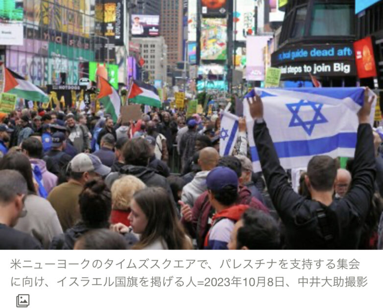 パレスチナ自治区ガザ地区を実効支配するイスラム組織ハマスがイスラエルへの大規模攻撃に踏み切ったことを受け、米ニューヨークでは8日、それぞれの立場を支持する集会があった。パレスチナとイスラエルの旗を持った人たちが、道を挟んでにらみ合う場面もあった。