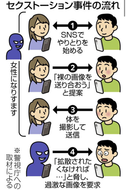 入手した性的な画像を基に金品や過激な画像を要求する性的脅迫(セクストーション)の被害相談が増えている。相談者の多くは10~20代で、男性が被害に遭うケースも多い。警視庁幹部は「不用意に自身の性的画像を送らないように」と注意を呼びかけている。