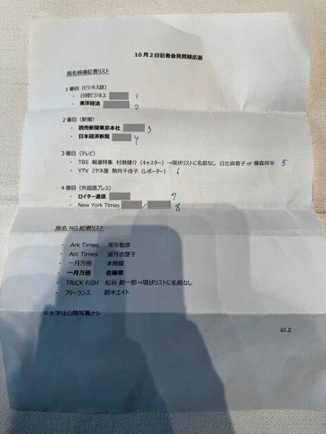 に行っていて生産性の高い時間だったと思いますが、後で紙1枚(=指名NGや指名候補の記者名と顔写真が載ったリスト)が発覚