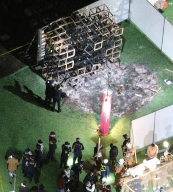 火災はオブジェの中を装飾していた木くずが落ちて投光器に接触し、発生したとされる。検察側は論告で「引火する危険性も認識できた」と指摘。弁護側は最終弁論で「火災までは予見できなかった」と主張した。