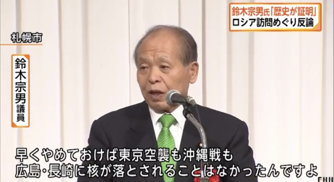 ロシア訪問をめぐり、日本維新の会を離党した鈴木宗男参議院議員が14日、訪問の動機を「第2次世界大戦の日本の経験を伝え、停戦を促すため」と説明した。