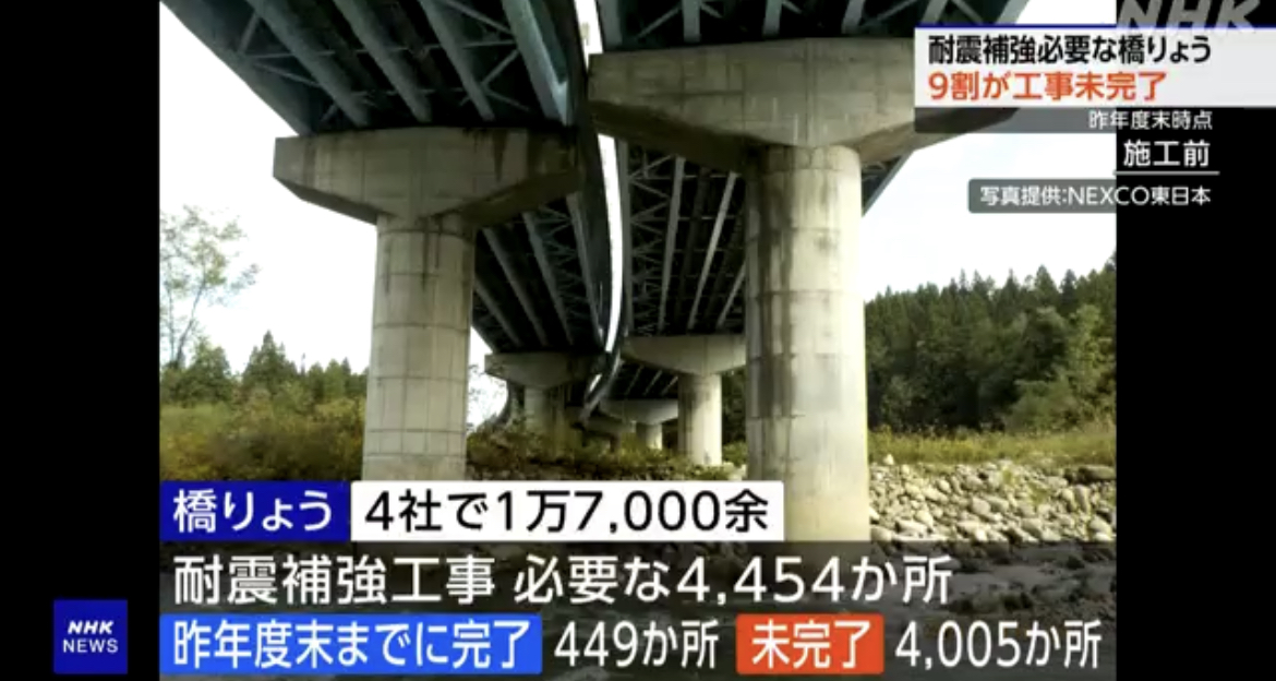 橋りょうは、4社で合わせて1万7000余りあり、このうち耐震補強工事が必要な4454か所を調べたところ、昨年度末までに完了していたのは449か所で、9割にあたる4005か所で工事が完了していなかったことがわかりました。
