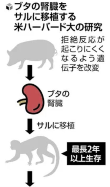 人に移植する臓器は提供者が少なく、慢性的に不足している。チームは、臓器の大きさや機能が人に近いブタの臓器で代用する方法を研究。腎不全患者など人への臨床試験の前段階として、サルに移植した。