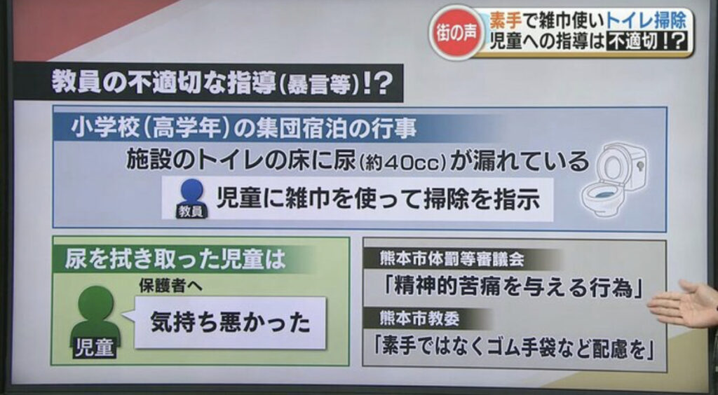 【熊本市】便器周りの尿、児童2人に雑巾使って素手で拭き取らせる…教諭の処分検討へ