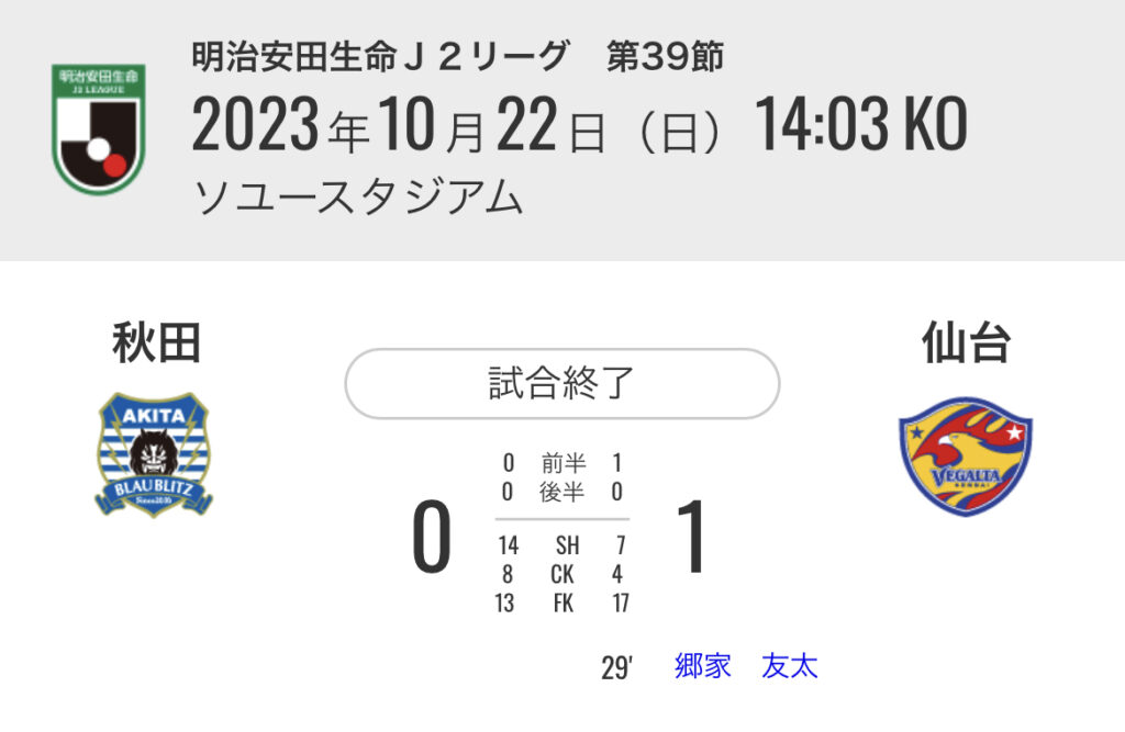 1: 久太郎 ★ 2023/10/22(日) 16:06:18.80 ID:oB3P8Xls9 秋田 0-1 仙台 [得点者] 29'郷家 友太(仙台) スタジアム:ソユースタジアム 入場者数:4,178人 https://www.jleague.jp/match/j2/2023/102201/live/#live/ 水戸 1-2 群馬 [得点者] 20'... -