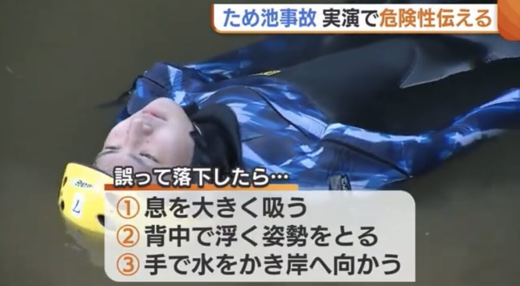 【新潟】ため池に落下したら…「声を出す、手を上げるは一番危険」水難事故の防止へ実演交え危険性伝える