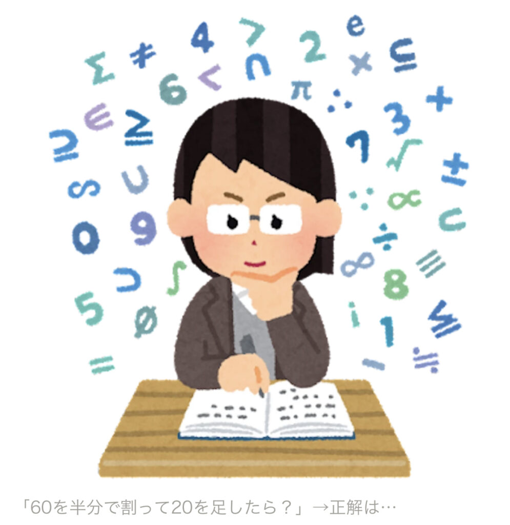 1: 少考さん ★ 2023/10/18(水) 08:12:40.45 ID:tEocLZxc9 「60を半分で割って20を足したら?」不正解続出の「算数ひっかけ問題」に反響「ビジネス現場で炎上する未来が…」「やーい引っかかった」|まいどなニュース https://maidonanews.jp/article/150242... -