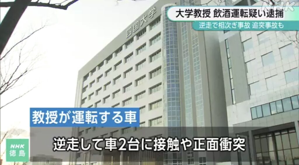 1: ごまカンパチ ★ 2023/10/17(火) 23:24:48.89 ID:LFWUhKSk9 https://www3.nhk.or.jp/lnews/tokushima/20231014/8020018791.html 酒を飲んで車を運転して道路を逆走し、別の車と接触したり衝突したりする事故を起こしたとして、徳島県内の私立大学の教授... -