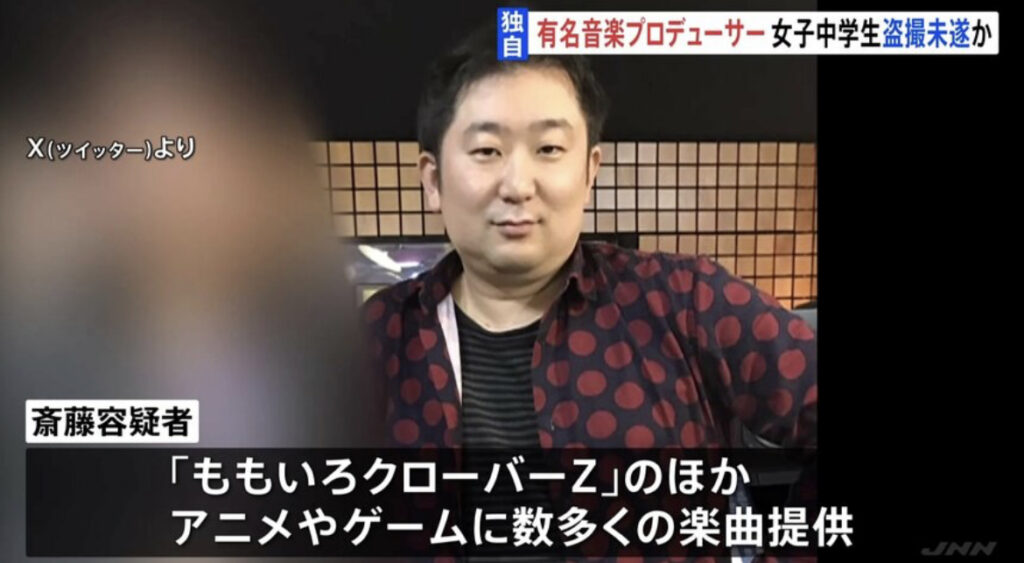 1: ちょる ★ 2023/10/17(火) 12:16:55.42 ID:??? TID:choru 人気アイドルグループ「ももいろクローバーZ」などに楽曲を提供していた音楽プロデューサーの男が、駅のホームで女子中学生を盗撮しようとしたとして逮捕されていたことがわかりました。 捜査関...