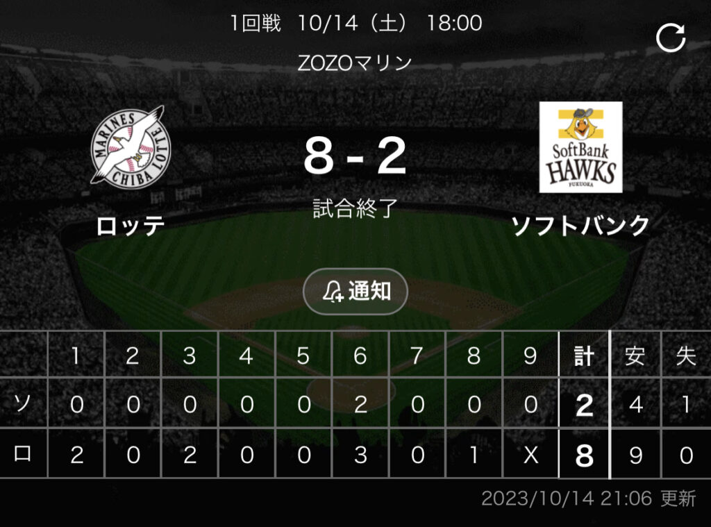 1: 鉄チーズ烏 ★ 2023/10/14(土) 21:03:45.98 ID:Bc6/vdt59 ソフトバンク 0 0 0 0 0 2 0 0 0|2 ロッテ 2 0 2 0 0 3 0 1 x|8 【バッテリー】 (ソ)スチュワート・ジュニア、ヘルナンデス、大津、嘉弥真、津森、...