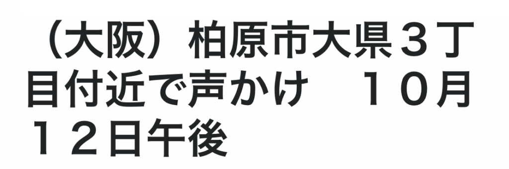 1: おっさん友の会 ★ 2023/10/13(金) 15:04:55.25 ID:1hBWsOWu9 大阪府警によると、12日午後3時10分ごろ、柏原市大県3丁目付近で児童への声かけが発生しました。(実行者の特徴:年配男性、白髪交じり、黒色メガネ) ■実行者の言動や状況 ・下校途中... -