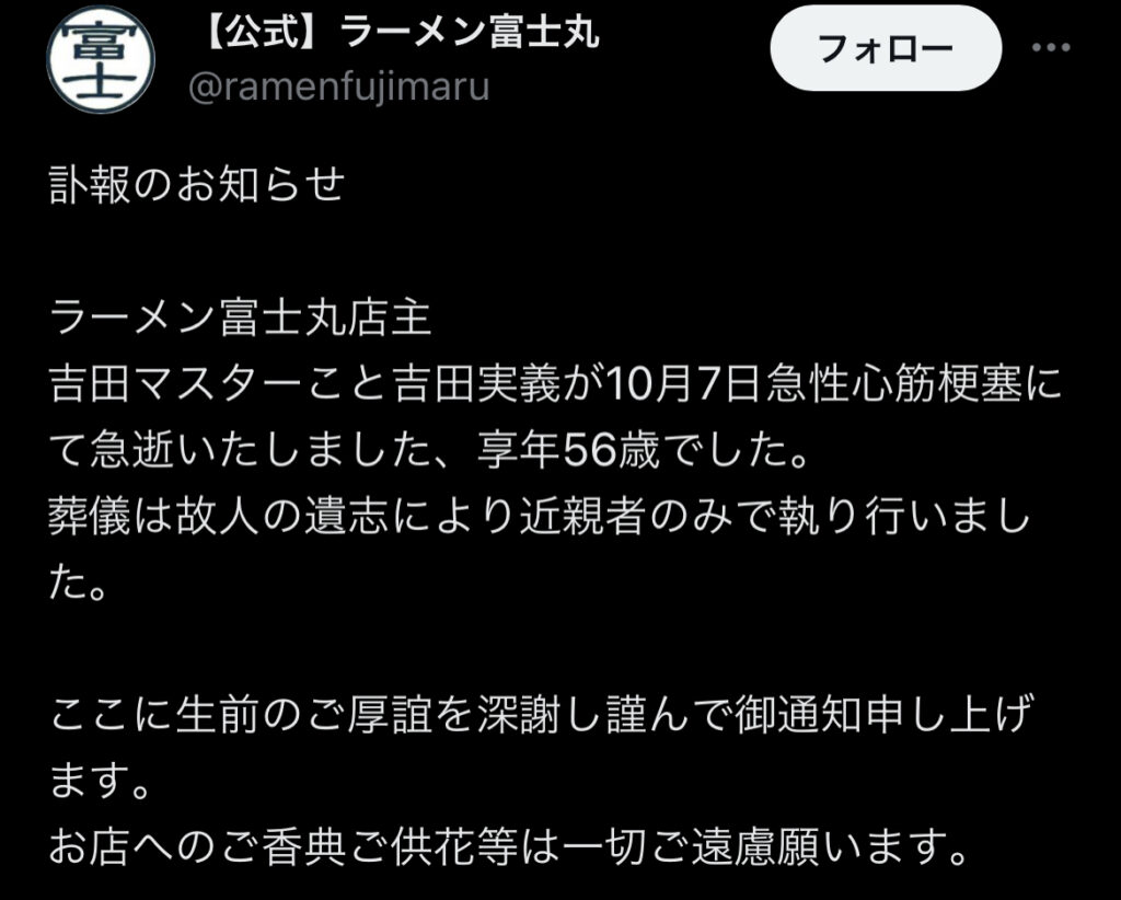 【訃報】二郎系ラーメン「富士丸」総帥 吉田実義氏 急性心筋梗塞により逝去享年56