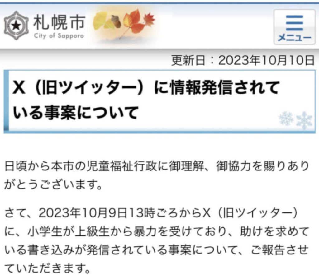 【いじめ】SNSで暴力を告発した小学生 無事に札幌市長に届く 札幌市が状況を発表「児童が受傷したことは事実」