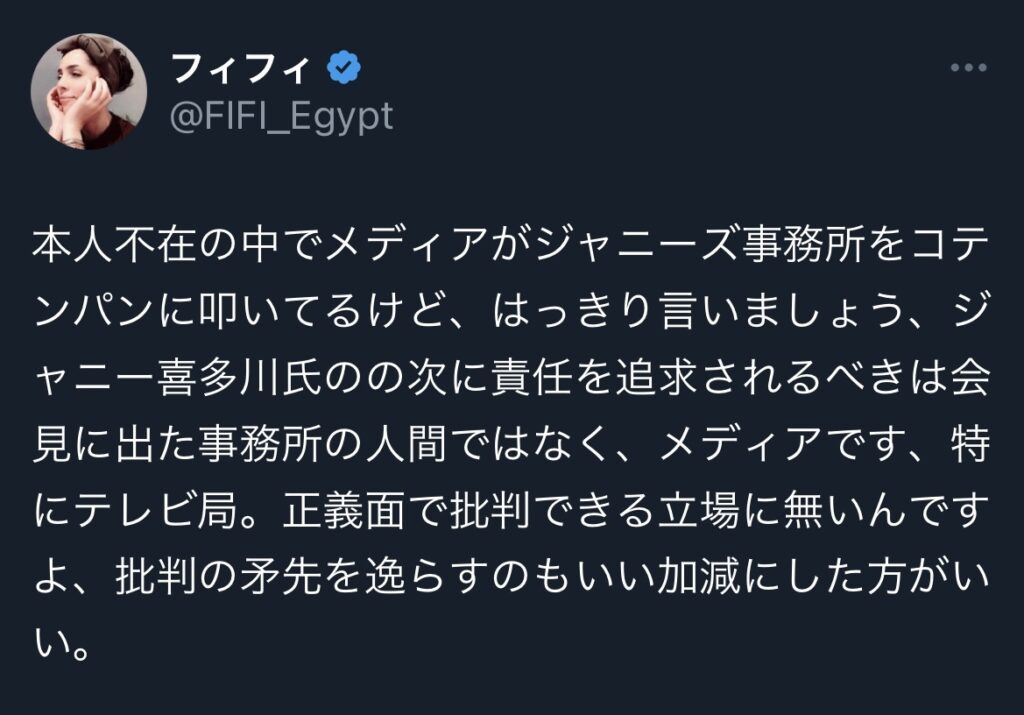 1: 牛丼 ★ 2023/10/09(月) 20:45:04.75 ID:A3g6Wf3h9 フィフィ @FIFI_Egypt 本人不在の中でメディアがジャニーズ事務所をコテンパンに叩いてるけど、はっきり言いましょう、ジャニー喜多川氏のの次に責任を追求されるべきは会見に出た事務所の人間ではなく...