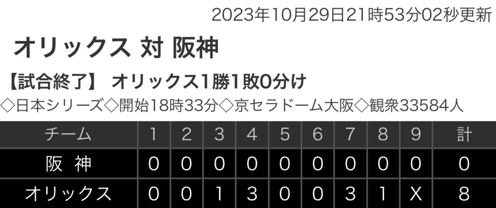 1: 鉄チーズ烏 ★ 2023/10/29(日) 21:42:52.00 ID:Q9YwO/z99 阪神 0 0 0 0 0 0 0 0 0|0 オリックス. 0 0 1 3 0 0 3 1 x|8 【バッテリー】 (阪)西勇、ビーズリー、岡留、島本、加治屋 - 坂本、長坂 (オ)宮城、宇... -