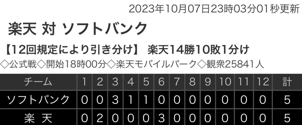 【野球】パ・リーグ E 5-5 H [10/7] 楽天-ソフトバンクは延長12回引き分け ソフトバンクCS確定