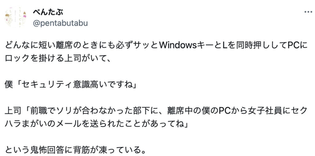 【仕事】短い離席でも必ずPCをロックする上司→理由を聞いたら、背筋が凍った「怖すぎる…」
