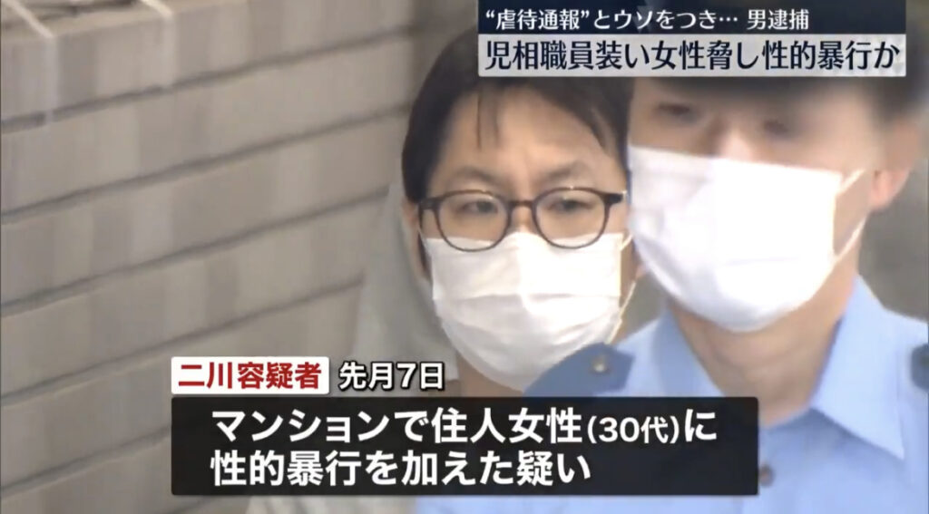 1: ちょる ★ 2023/10/06(金) 12:00:44.79 ID:??? TID:choru 児童相談所の職員を装って面識のない女性の自宅を訪ねて「児童虐待の通報が入っている。誠意を見せないと親族に連絡する」とウソを言って脅し、女性に性的暴行を加えたとして、43歳の男が逮捕さ...