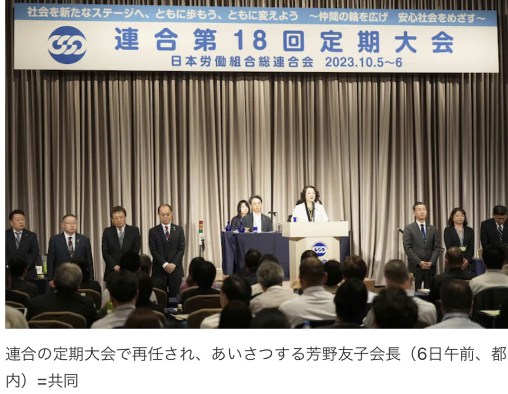 1: 蚤の市 ★ 2023/10/06(金) 12:12:57.51 ID:FZAJN3gE9 連合は6日、都内で開いた定期大会で芳野友子会長を再任する執行部人事を承認した。芳野氏は2期目に入り任期は2025年までの2年間となる。賃上げ率の継続的な向上といった重点課題に取り組む。政策実現... -