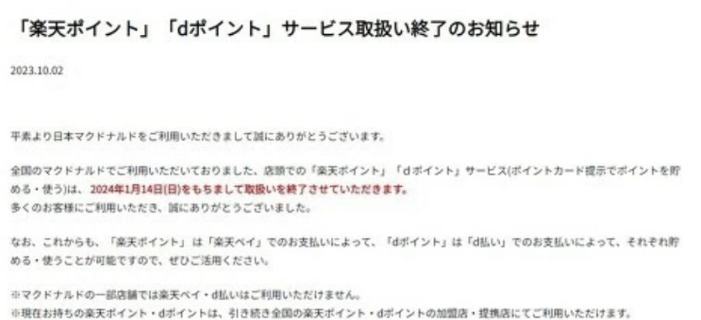 【終了】マクドナルド、「楽天ポイント」「dポイント」の取り扱い終了へ 24年1月まで