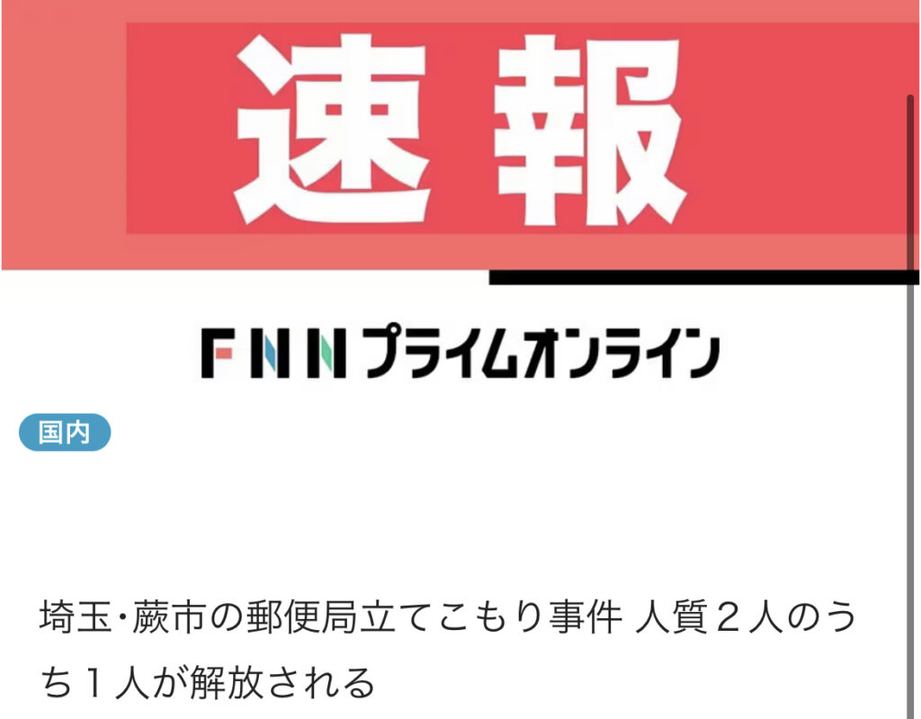 埼玉・蕨市の郵便局立てこもり事件 人質2人のうち1人が解放される…