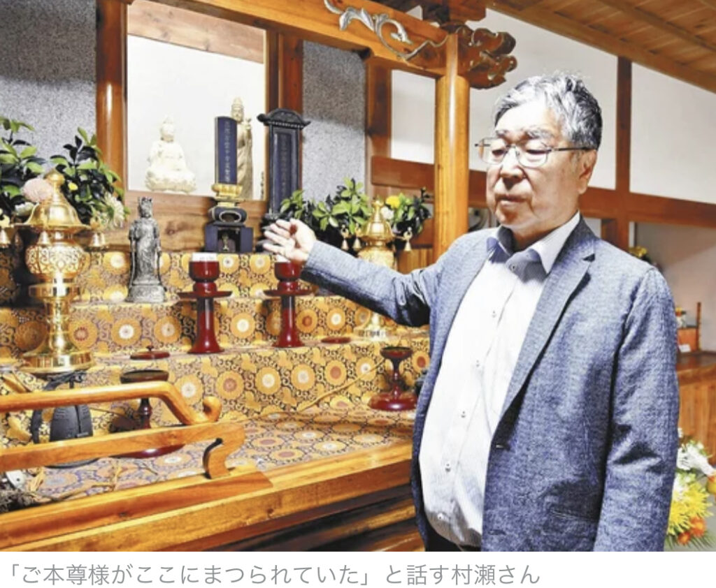 1: ちょる ★ 2023/10/27(金) 12:33:42.94 ID:??? TID:choru 村瀬さんの父親の敬三さんは、昨年3月に90歳で亡くなるまで観音寺の永久総代を65年間務めてきた。「おやじは寺を守ってきたことを誇りにしていた。まさかご本尊様が盗まれるとは思っていな... -