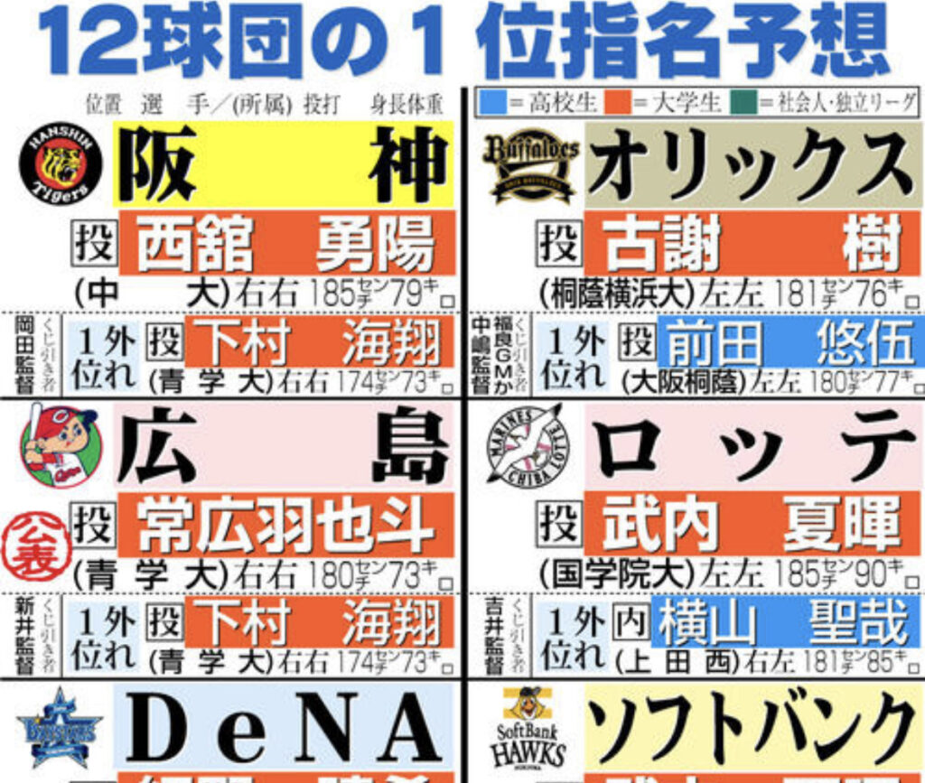 【ドラフト】12球団1位入札予想と外れ1位予想 事前公表は4球団のみ/一覧