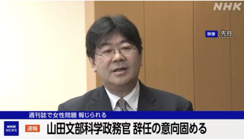 1: 少考さん ★ 2023/10/25(水) 19:40:54.60 ID:1dCljAAk9 山田文部科学政務官が辞意固める 週刊誌が女性問題報じる | NHK https://www3.nhk.or.jp/news/html/20231025/k10014237431000.html 2023年10月25日 19時30分 山田文部科学政務官は、週刊誌で女性問... -
