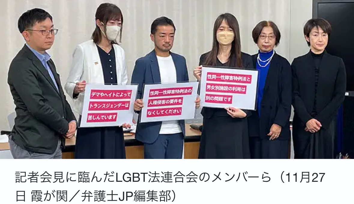 最高裁が先月25日に「性同一性障害者の性別の取扱いの特例に関する法律」(以下、特例法)の「生殖不能要件」(3条1項4号規定)が憲法13条に違反していると判断した後、特に女性トイレや公衆浴場など「女性スペース」の利用をめぐってトランスジェンダー女性に対するヘイトが巻き起こっていることなどを受け、LGBT法連合会が27日、厚生労働省で記者会見を開いた。