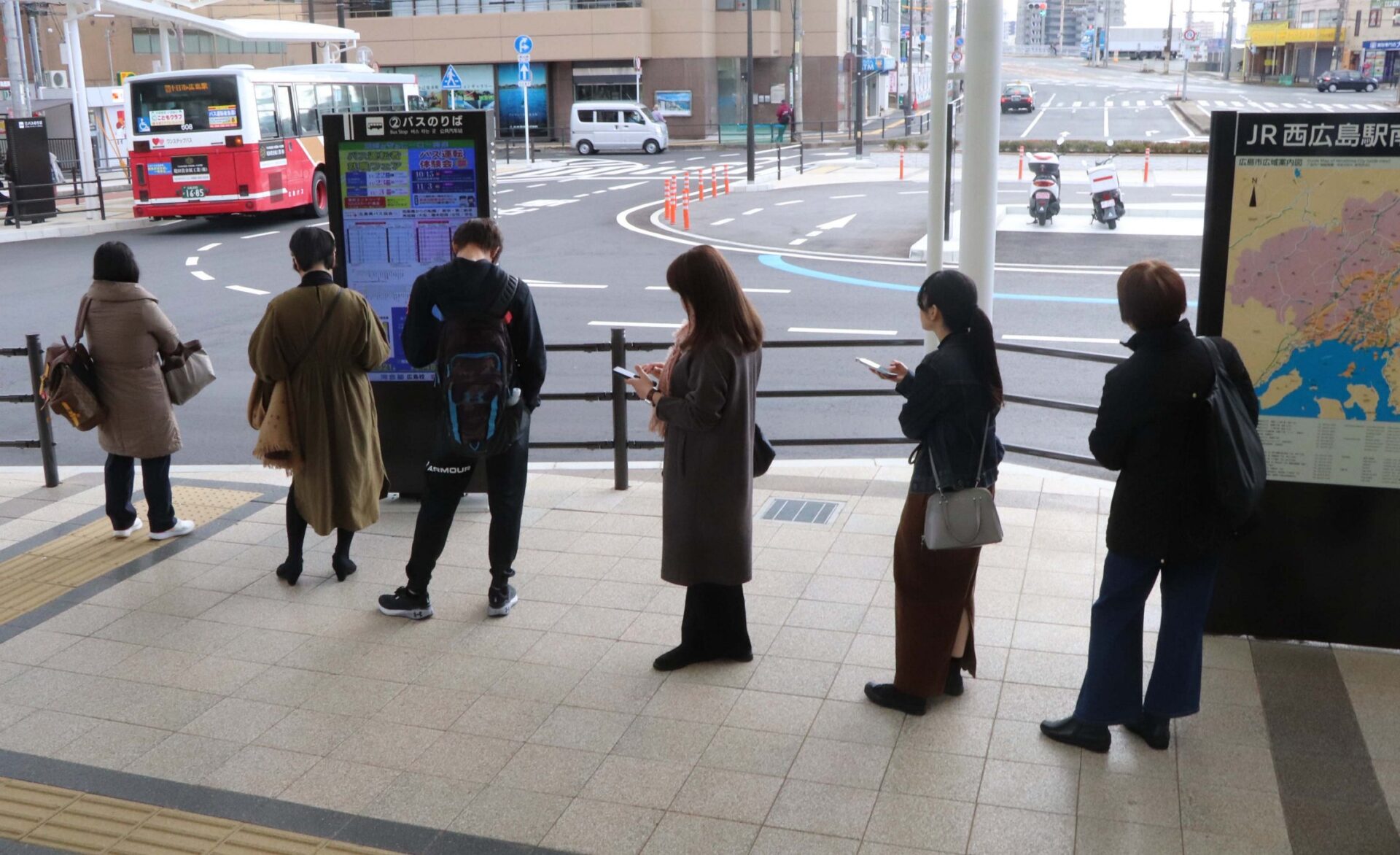 広島市がJR西広島駅(同市西区)の駅舎改築を機に南口に整備したバス乗り場。完成から2カ月余りで「使いづらくなった」との声が相次いでいる。利用者を行き先別に整理する白線がなくなり、「割り込む人が増えた」との不満も。市は利用者の要望を踏まえ、応急措置として路面にテープを貼ってしのいでいる。11月中旬の夕暮れ時。大迫団地、共立ハイツ、高須台の3方面行きが一つになったバス乗り場で、約20人が一列に並んでいた。バスが到着すると、その方面へ向かう人だけが列を崩して抜け出し、乗降口へ。買い物帰りの男性(78)は「列が意味をなさない。割り込む人も増えた」とこぼした。