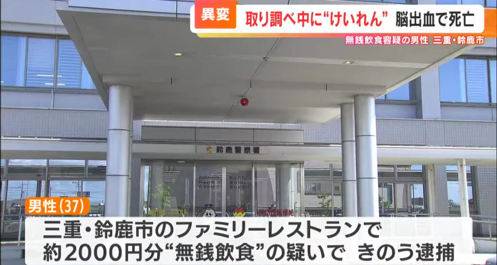 1: ◆hEpW0nDspK9l 武者小路バヌアツ ★ 2023/12/21(木) 13:15:05.42 9 男性(37)が取り調べ中にけいれんし死亡 ファミリーレストランで約2000円分を無銭飲食した疑い 2023年12月20日(水) 三重県鈴鹿市で、無銭飲食した疑いで逮捕されたフィリピン国籍の男... -