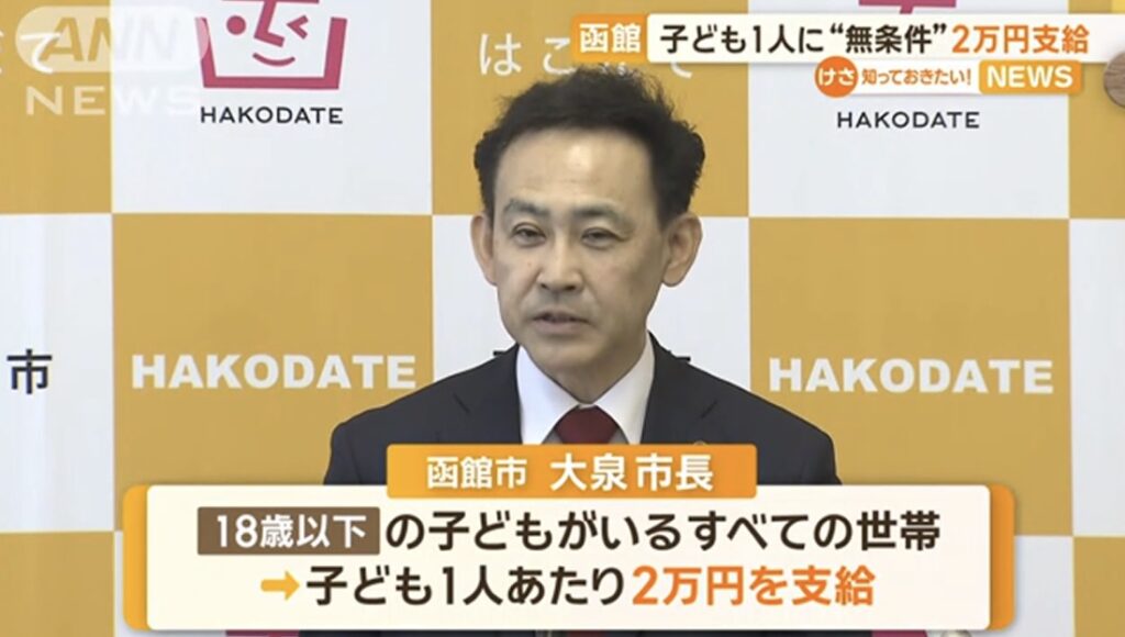1: 鮎川 ★ 2023/12/21(木) 10:35:28.73 ID:??? TID:ayukawa 函館市の大泉潤市長は20日、物価高対策として18歳以下の子どもがいるすべての世帯に、子ども1人あたり2万円を支給すると発表しました。大泉市長 「子どもを安心して育てていける、環境づくりが大... -