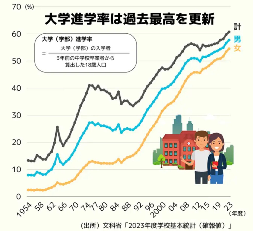 1: 名無しさん@涙目です。(庭) [US] 2023/12/20(水) 21:02:00.02 ID:Kla4qxZe0● BE:323057825-PLT(13000) sssp://img.5ch.net/ico/999991500948658.gif 2023年度の大学(学部)進学率が57.7%と、過去最高を更新したことが12月20日、文科省が公表した学校... -