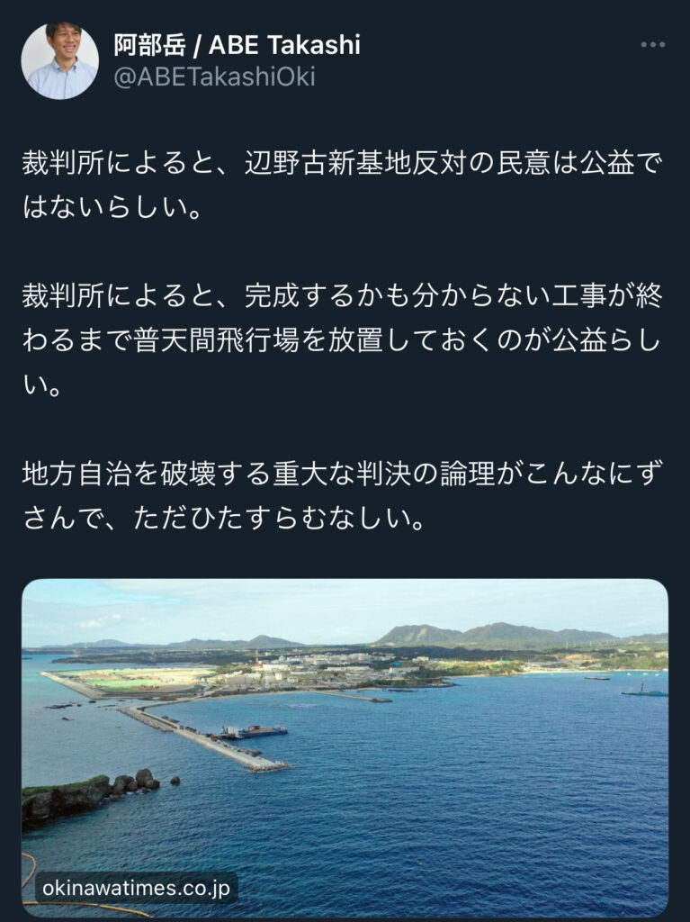 阿部岳氏「裁判所によると辺野古新基地反対の民意は公益ではなく…普天間飛行場を放置しておくのが公益らしい…ただひたすらむなしい」
