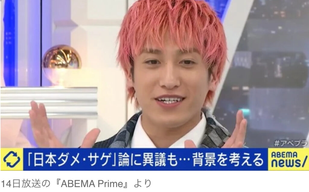 1: 伝説の田中c ★ 2023/12/17(日) 20:54:58.72 ID:1qk2wPtE9 お笑いコンビ・EXITがMCを務める『ABEMA Prime』が14日に放送。この日の放送では「少子高齢化や円安で日本は衰退する」「他国と比べて日本はもうダメ」など、自国を卑下するような「日本ダメ...