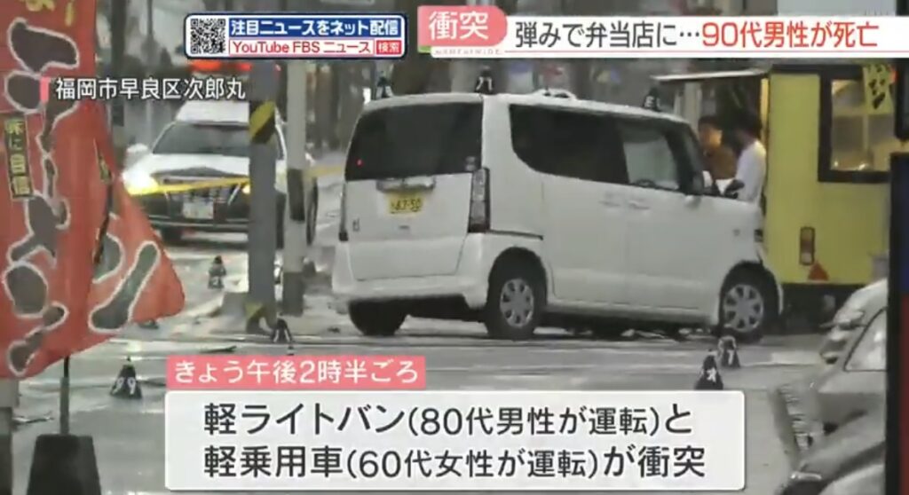 1: ぐれ ★ 2023/12/12(火) 07:46:13.63 ID:OOUC8qDd9 >>2023/12/11 19:00 FBS福岡放送 11日午後、福岡市早良区で車2台が出合い頭に衝突しました。うち1台は近くの弁当店に突っ込み、90代の男性が意識不明の重体となっていましたが、その後、死亡が確... -