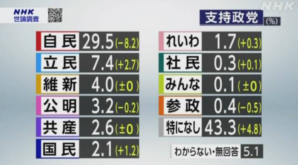 【NHK】各党支持率 自民急落 政権復帰後初めて30%下回る
