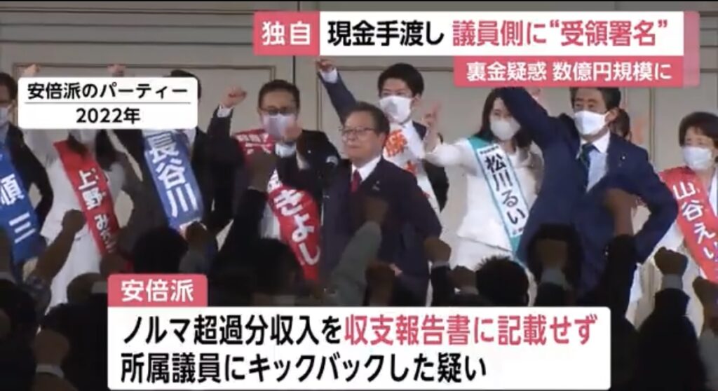 1: ばーど ★ 2023/12/11(月) 12:27:42.89 ID:fB44uWhl9 自民党・安倍派の政治資金パーティーをめぐる問題で、派閥側が議員側に現金でキックバック分を渡し受領書に署名をさせていたケースがあることが分かった。 安倍派では、政治資金パーティーで、販売ノ... -