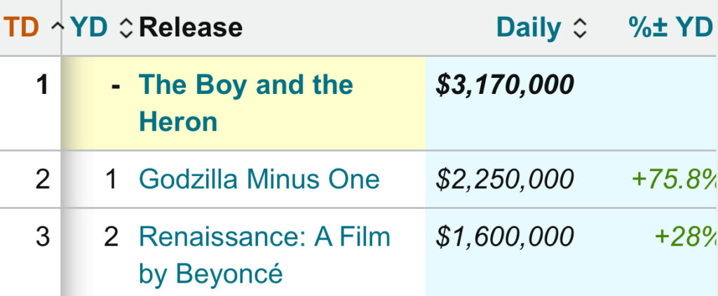 1: 名無しさん@涙目です。(東京都) [KR] 2023/12/10(日) 12:04:36.97 ID:B7/90JXO0 BE:422186189-PLT(12015) sssp://img.5ch.net/ico/folder1_03.gif 1. The Boy and the Heron 2. Godzilla Minus One 3. Renaissance: A Film by Beyonce 4. Trolls Band ... -