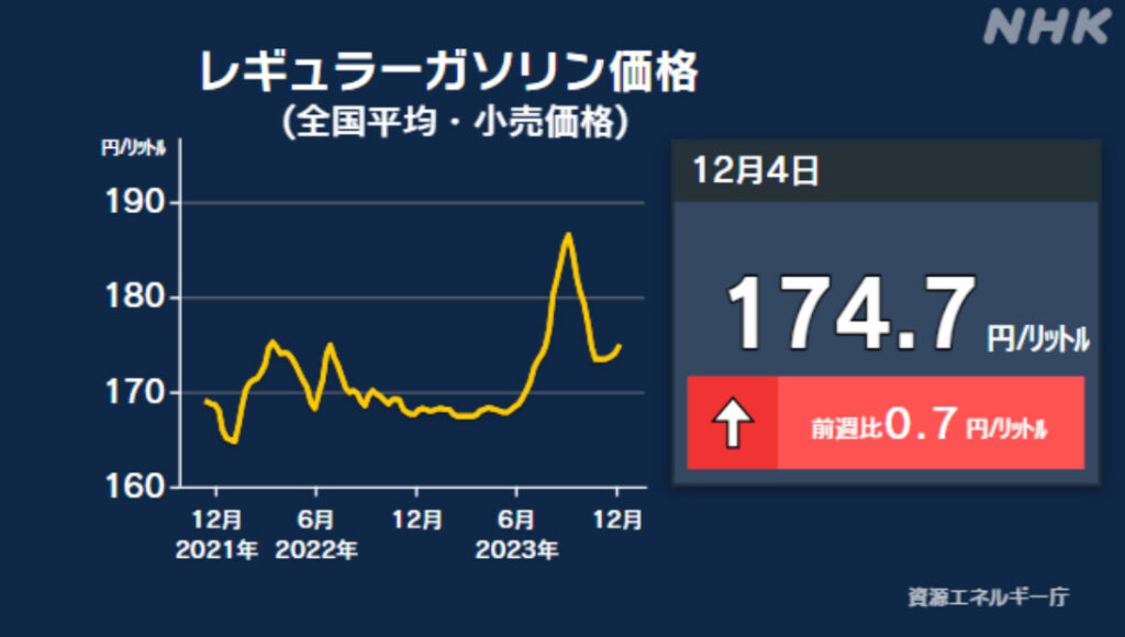 1: ぐれ ★ 2023/12/07(木) 10:13:09.65 ID:0zSuQiK89 >>2023年12月6日 15時02分 NHKレギュラーガソリンの小売価格は4日時点の全国平均で、1リットル当たり174.7円となり、4週連続で値上がりしました。 国の委託を受けてガソリン価格を調査している石... -