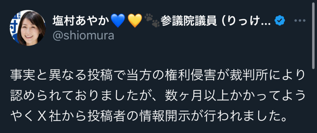 【ツイッター】 立憲民主党・塩村あやか議員 「事実誤認のデマツイートを開示しました」