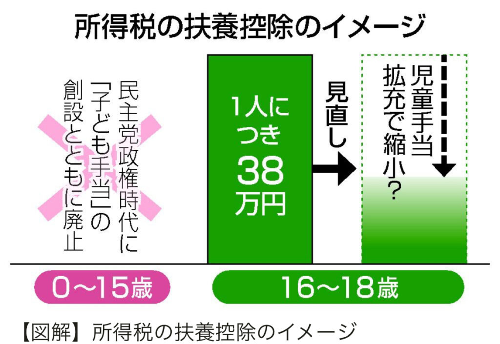 1: 蚤の市 ★ 2023/12/05(火) 23:05:17.47 ID:pcFvADvR9 政府・与党は5日、高校生(16~18歳)の子どもがいる子育て世帯の扶養控除について、所得税の控除額を1人当たり年間38万円から25万円に、住民税を33万円から12万円にそれぞれ引き下... -