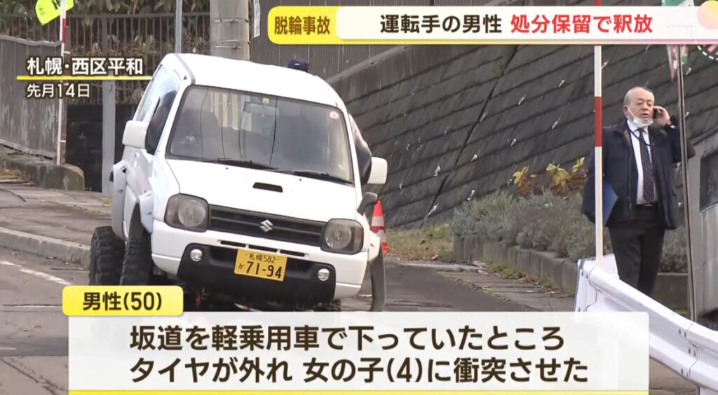 1: 名無しさん@涙目です。(東京都) [US] 2023/12/05(火) 18:14:47.52 ID:OnAX54qG0● BE:866556825-PLT(21500) 車を運転していた男性 処分保留で釈放 軽乗用車脱輪衝突事故 女の子はいまだ意識不明の重体 札幌市 https://news.yahoo.co.jp/articles/b7... -