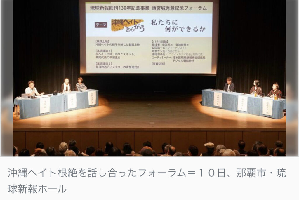 【社会・くらし】沖縄のヘイト根絶へ 「差別禁止法が必要」 辛淑玉さんら討論 那覇でフォーラム (編集委員・阿部岳氏)